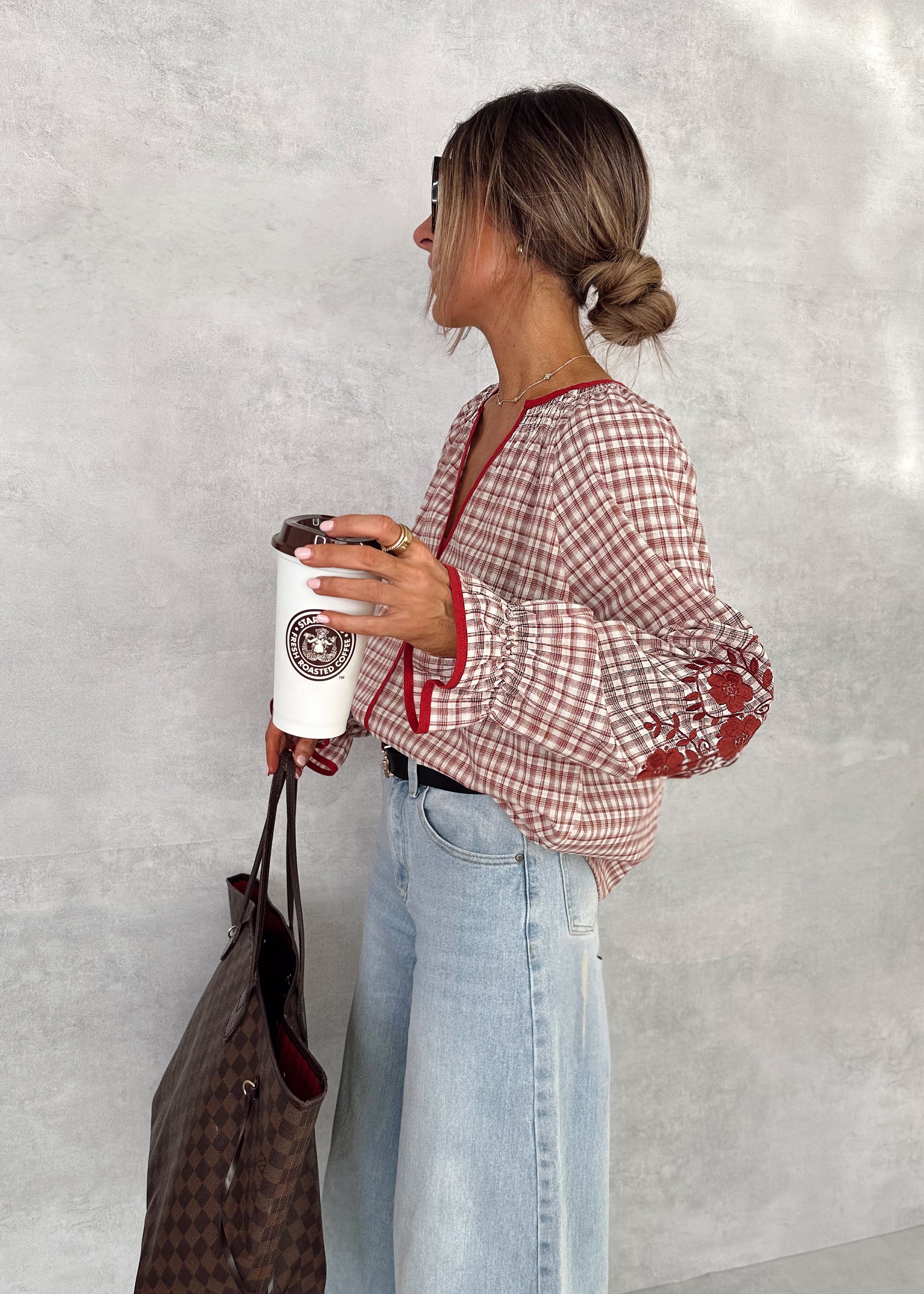 Blusa de cuadritos roja con detalle bordado en mangas.