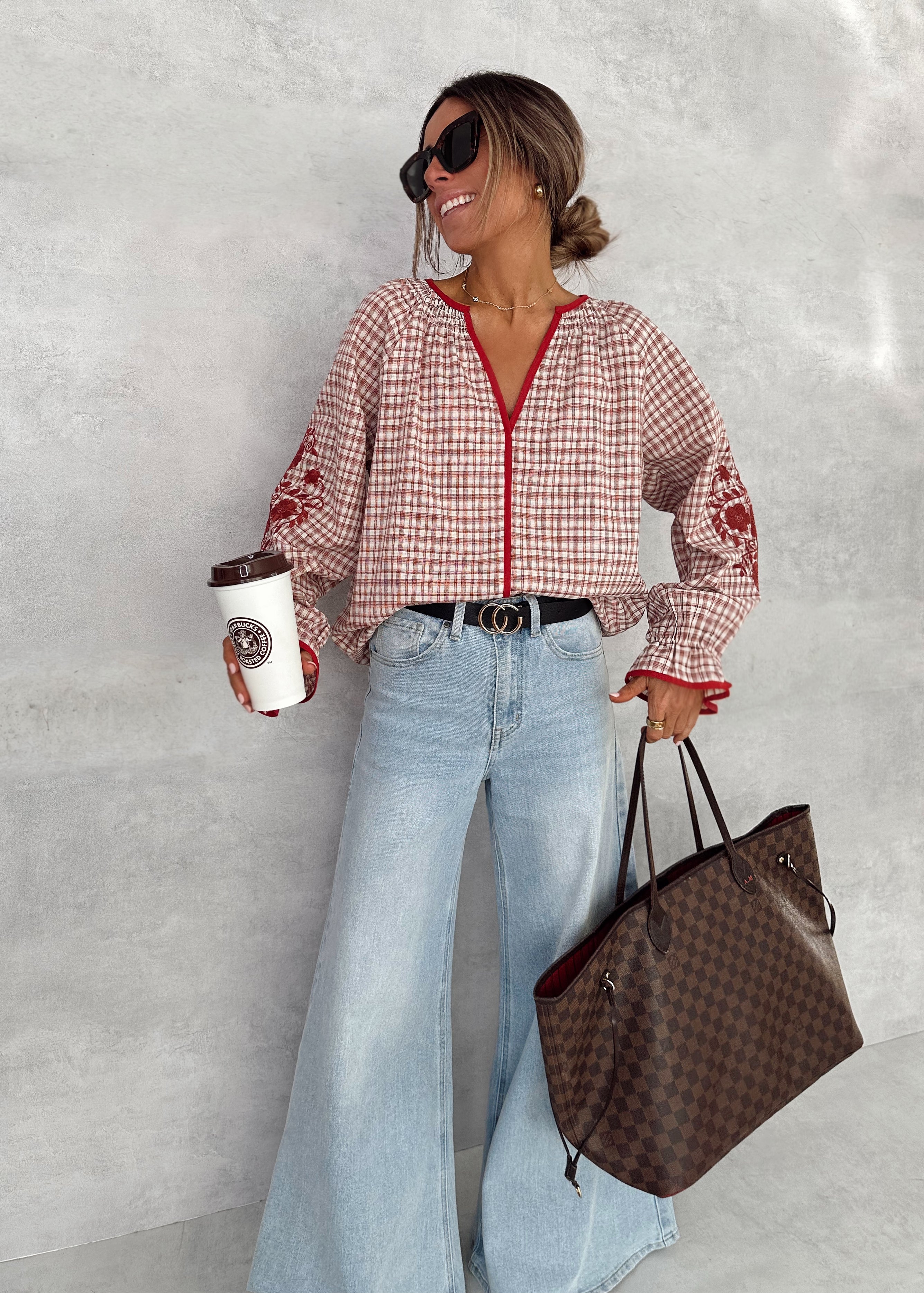 BLUSA CUADROS CON BORDADOS ROJO